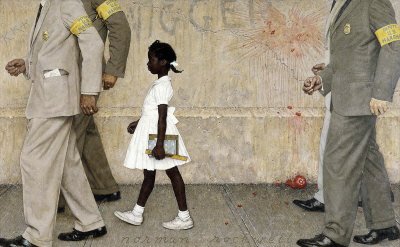 The Events Behind The Problem We All Live WithGiclee Prints on Archival Paper: When Look magazine published The Problem We All Live With in 1964, the event depicted was already out of the news. This particular event happened in 1960. The problem, however, was far from vanquished, just as it is far from vanquished even today. The problem referred to is, of course, racism and all the trouble it causes. Racially segregated schools, bathrooms and restaurants were only visible manifestations of the root. Class prejudice,in my opinion, is just as evil as race prejudice, but that is a discussion for another time. The event so masterfully illustrated by Rockwell was the racial integration of the New Orleans public school system. After the 1954 United States Supreme Court decision, Brown vs Board of Education, racial segregation in public schools was ruled to be unconstitutional. So, on November 14, 1960, little six year old Ruby Bridges attended the then all white William Franz Elementary School at 3811 N Galvez St in New Orleans, Louisanna. She was not welcomed with open arms. She was escorted to school that first day and each following day by United States Marshalls. She was the only child in her classroom that first year. Many white children did not attend school that first year simply because Ruby was attending that school. And yet she persevered. The school was eventually integrated largely because of her courage and persistence. The Models for The Problem We All Live WithThe hand and body models for the U.S. Marshalls were Frederick J. Oczkowski, William Baldwin and William J. Obanhein. Photographs in Norman Rockwell: Behind the Camera by Ron Schick reaveal that many different shots were taken for the Marshalls hands and bodies. There were actually three models who posed for the role of Ruby Bridges. They were all from the Stockbridge, Massachusetts area. One of the girls was Lynda Gunn. Again, photos in Behind The Camera, show the three young girls who posed. Ron Schick, the author of that book, states that the final figure in the finished painting is a composite of all three. On the Surface of The Problem We All Live WithThe Problem We All Live With is one of Norman Rockwell's most famous and loved paintings. Rockwell captured the essence of this little black girl's historic walk into school. She is accompanied and guarded by four United States Marshalls. These men are all white. All are wearing business suits. All are wearing yellow arm bands proclaiming their office. They also wear badges on the front of their suits. The marshalls are faceless. The images of the marshalls remind me of stone pillars, solid, strong and, if necessary, unmoveable. They needed to be strong and solid, because there was an ugly mob there to greet Ruby that first and every day of the first school year. They had their jobs to do. And, yet, their job was not necessarily just to protect young Ruby Bridges as much as it was to fulfill the instutition of the law. Rockwell shows us the court's order for integration in the jacket pocket of the lead Marshall closest to our viewpoint. Focus on Ruby BridgesThe focus of the painting, though, is little Ruby Bridges. This is as it should be. She is dressed in a dress that is pure white, a contrast to her dark skin. This is probably one of her best dresses, maybe even her best Sunday dress. She is carrying her two school books, her ruler and her pencils. She is staying right behing the two lead marshalls. She actually looks very brave, and indeed she was very brave, whether she realized it at the time or not. The only indication we can see of the mob at the school is the background of the painting. The background shows the mob's reaction to racial integration of the schools. A racial slur (that hateful "N" word) is scrawled on the wall in the center of the painting. The initials KKK also appear in the upper left corner of the background. A tomato has been thrown by a member of the mob. It looks as if it just barely missed little Ruby. That tomato was thrown so hard that its juice splattered in a radiant pattern and parts of its pulp are scattered on the wall. The spent tomato rests against the wall. The angle of the tomato's trajectory implies to us that little Ruby is walking right past the angry mob. And yet Ruby and her guardians press onward toward their goal. The Symbolism of The Problem We All Live WithRockwell did not usually make his paintings hard to understand. He painted for his readership, and that readership was, by and far, ordinary folks. By the same token, he always spent a great deal of time on details and getting his composition just like he wanted it to appear. The faceless United States Marshalls represent the power of the US government to enforce its rules. Their facelesssness shows the blindness of justice in a society ruled by law. The law is being enforced without consideration to the majority of the people involved in this episode. That majority, not shown except through the inferences of the tomato and racial epithets, does not want that school integrated. Their opinion and wishes do not change the rule of law or its enforcement. Another important symbol is the white dress Ruby is wearing. Ruby Bridges's motives were pure. She was not aware that she would become such an historic figure. She was only a little girl going to school. Contrast Ruby's innocent motives with the angry mob. That mob is symbolized by the tomato, bright red and shattered with its life force crushed, released and running in too many different directions to be sustained. Showing some irony, Rockwell painted the detritus from the thrown tomato only soiling the racial slur on the wall of the school. In contrast to Ruby and her school supplies, the tomato and the Marshall's badges and armbands, the whole rest of the painting is rendered in muted tones, pastels and grey tones. Reactions to The Problem We All Live WithRockwell received many letters in response to The Problem We All 