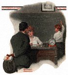 Children Dancing at a PartyGiclee Prints on Archival Paper: When this was published, World War I was in full swing. Americans needed a distraction from the grim realities of war. Rockwell was just the one to provide that distraction. Americans needed a distraction from the grim realities of war. Rockwell was just the one to provide that distraction. In this painting, Norman Rockwell returned to what he knew best. Children in humorous situations, such as presented here, had long been a staple of popular magazines. The humorous situation in this painting is one to which most of us can relate. Even when the social situation called for pretending like nothing happened, most of us have been either the toe stepper or steppee. (Isn't it fun - making up words?) And who hasn't stepped on a toe or two dancing while dancing? I have lost count of the toes I have stepped on, both on and off the dance floor. Here we see two young couples at a party dancing. All the children are dressed in their nice clothes. All are wearing party hats, except one. Children Dancing at a Party was only one of 322 Norman Rockwell Saturday Evening Post covers; Here is the list of Norman Rockwell Saturday Evening Post cover illustrations.